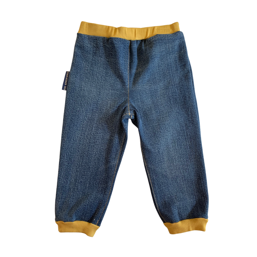 • The denim in the Little Adventurer Pant has some stretch because it is made with cotton blend Pre-Adventured Denim. Other materials such as spandex, rayon, polyester, elastane, viscose or lycra have been blended with the cotton.