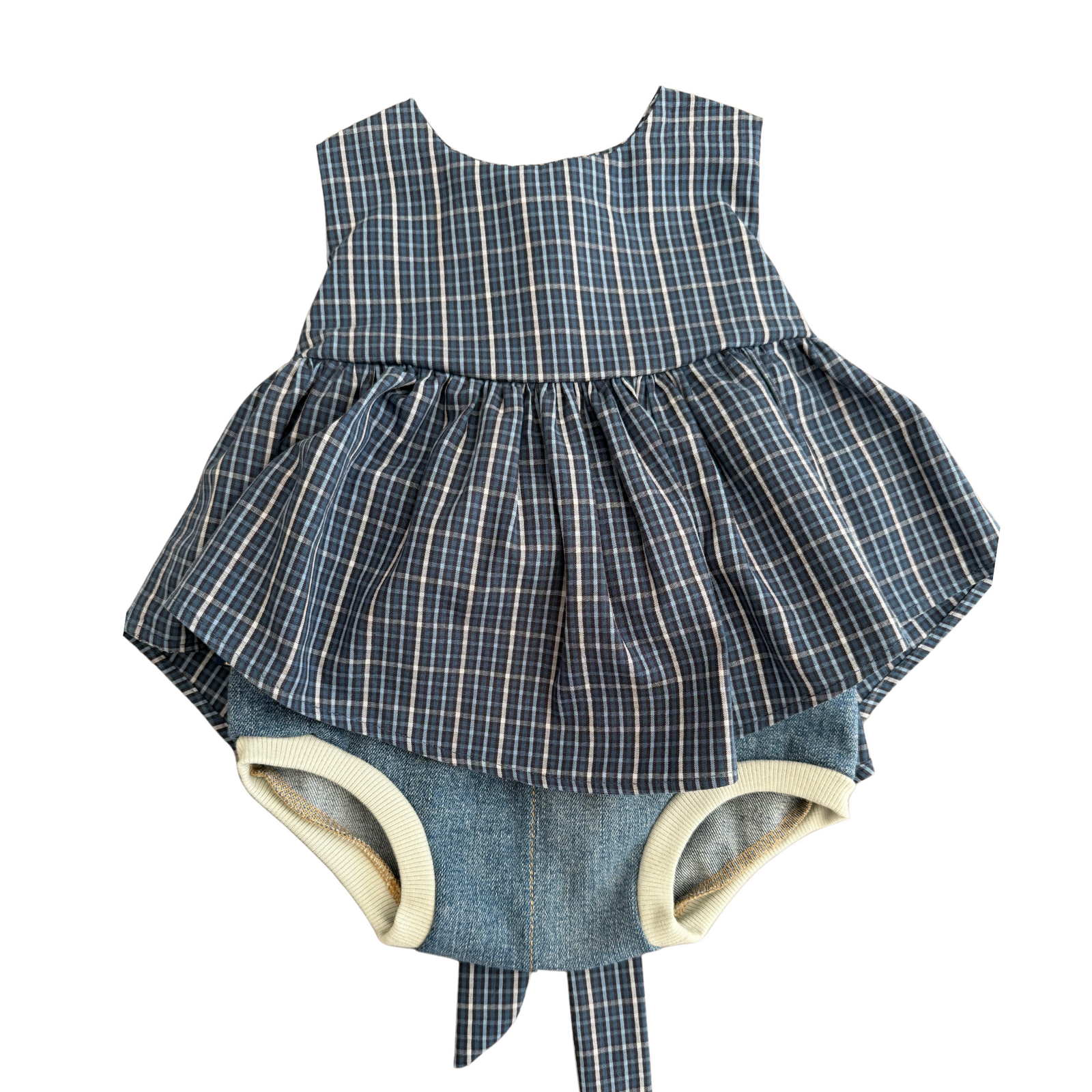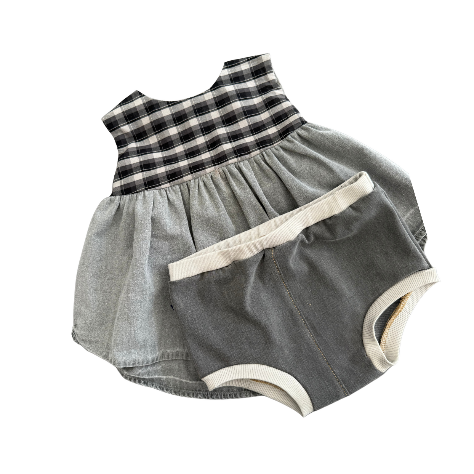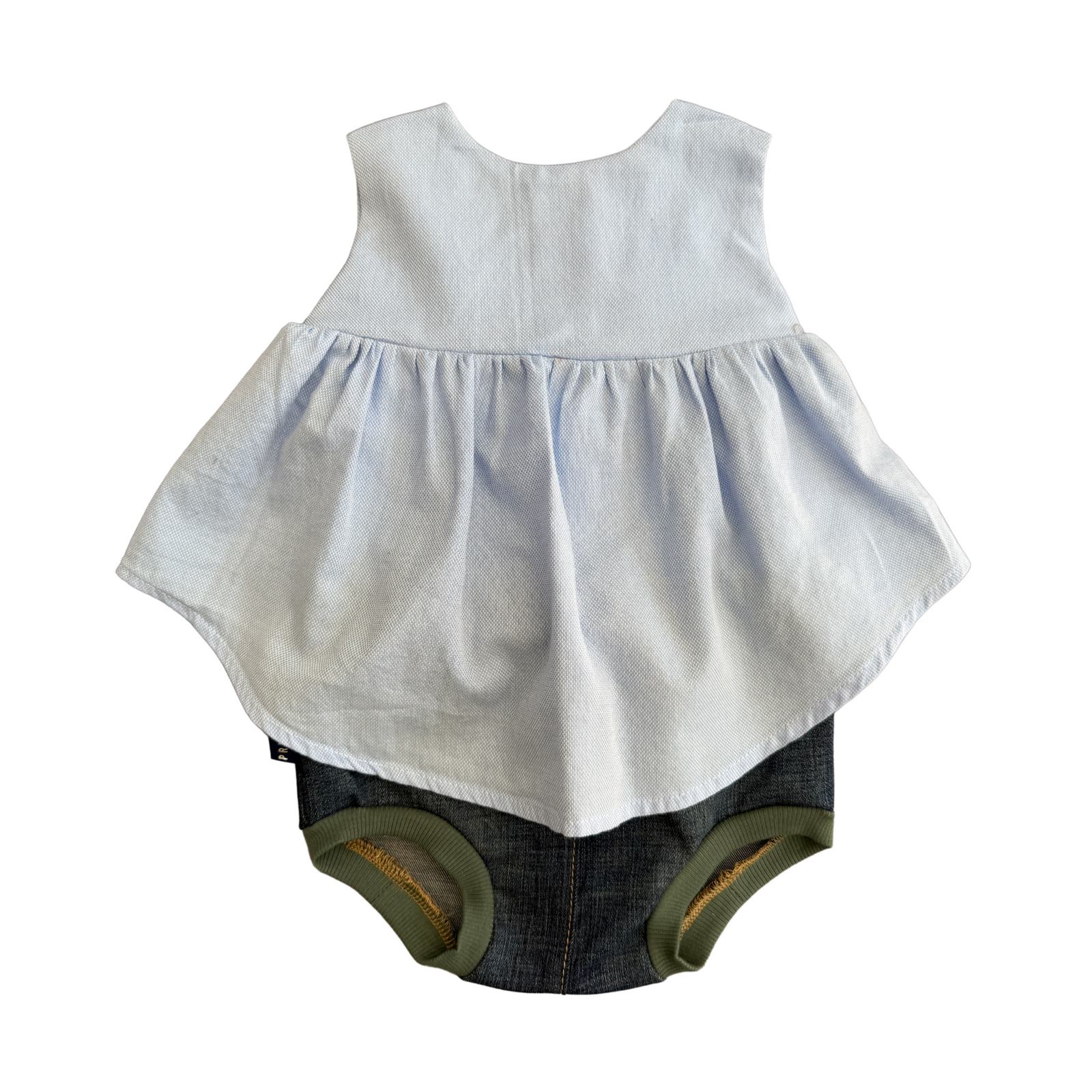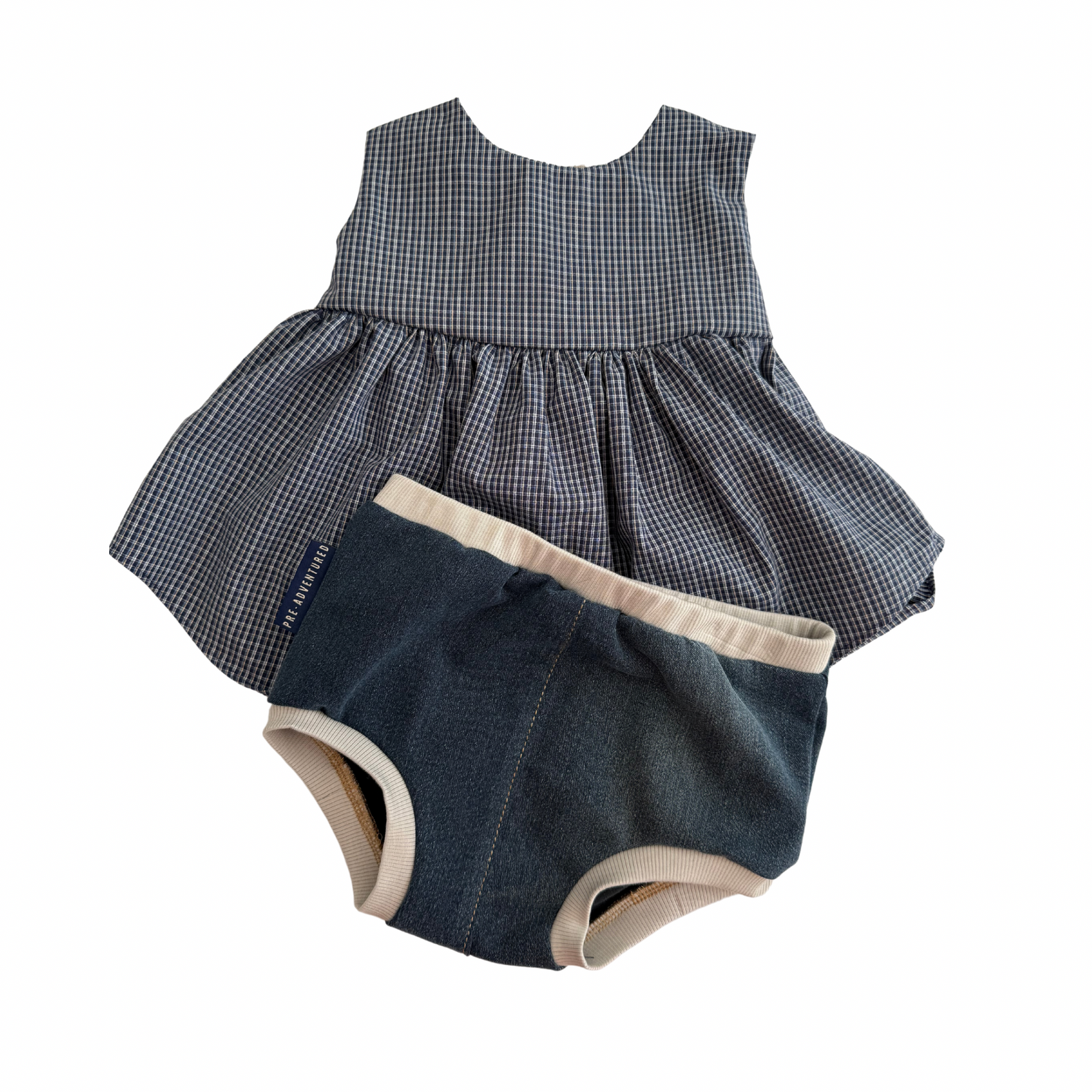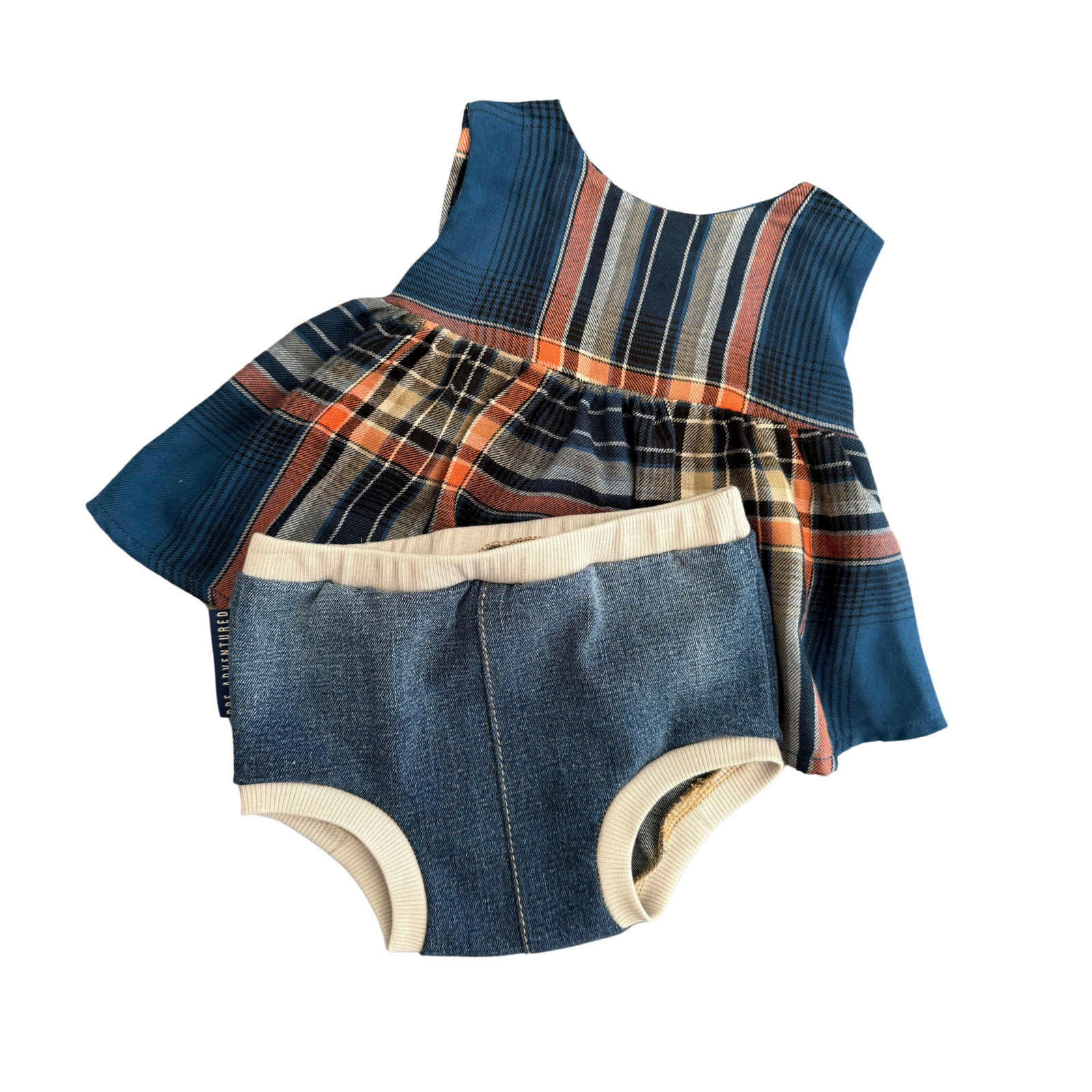 Fyne's Meadow Dress is simply adorable! Made from used dress shirts, each Meadow Dress is one of a kind. Used dress shirts are the perfect garment to upcycle because they are often made of high-quality material and only have small parts of damage that make them unwearable in their original form. The dress features buttons and a tie at the back and is paired with a loose-fitting jean bloomer for extra versatility.