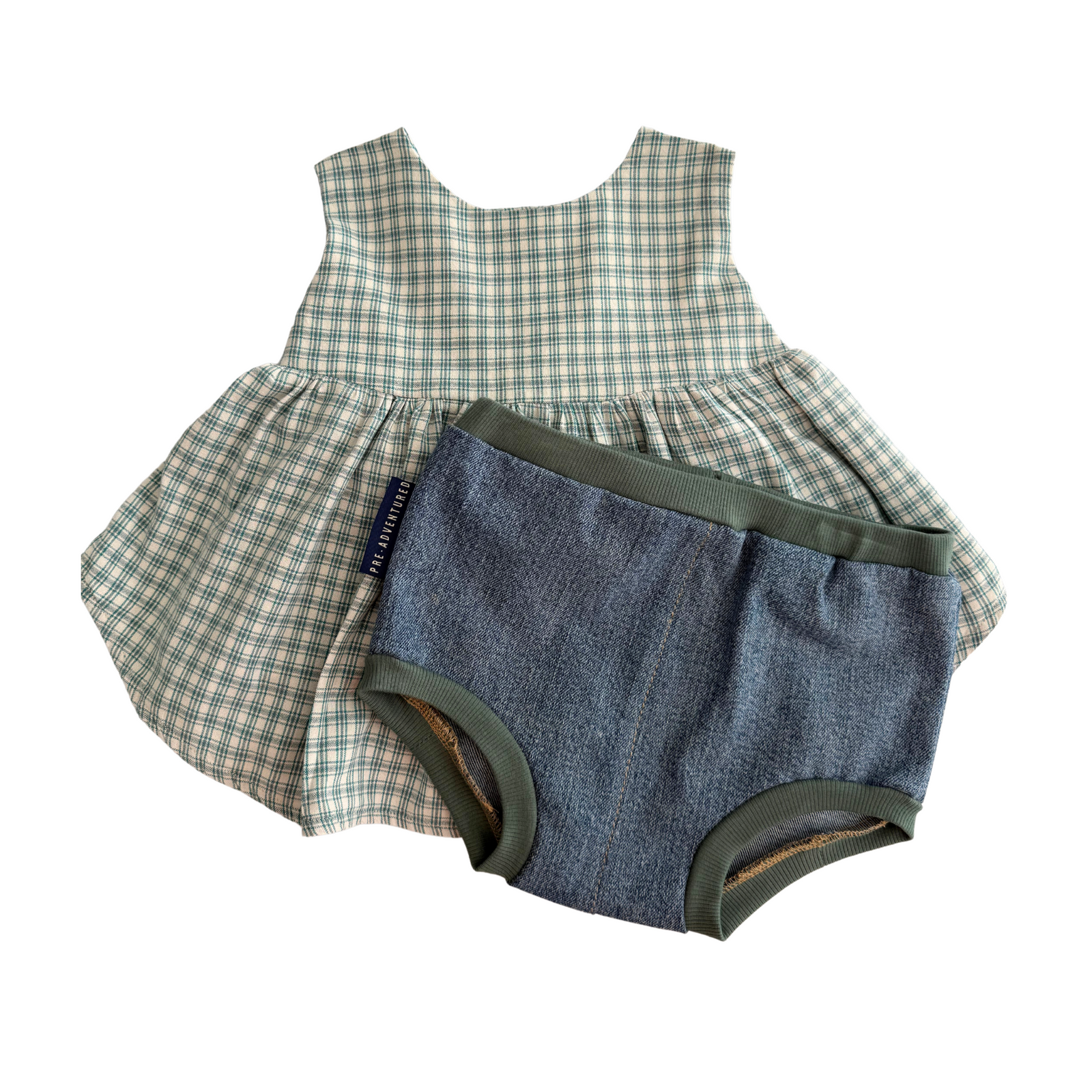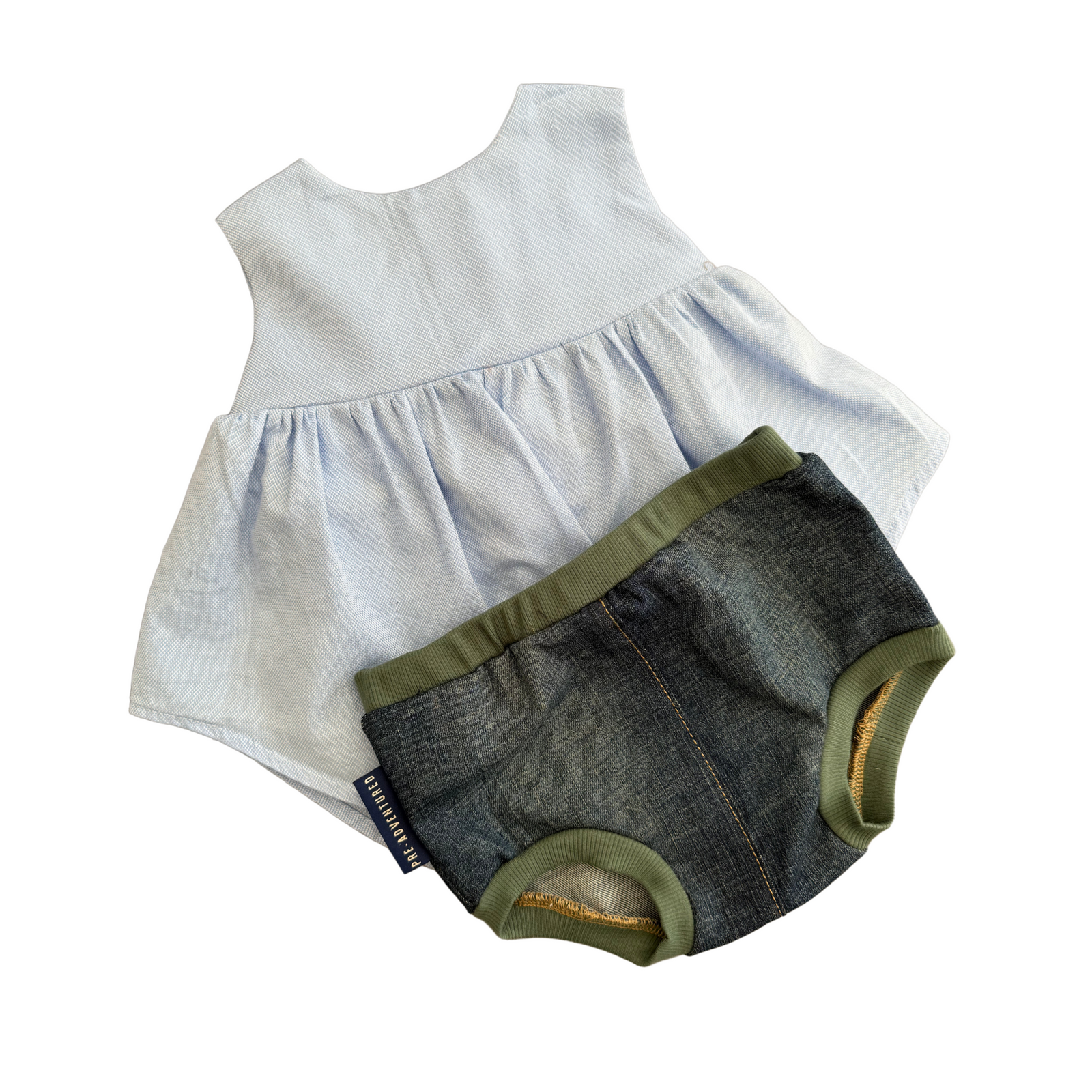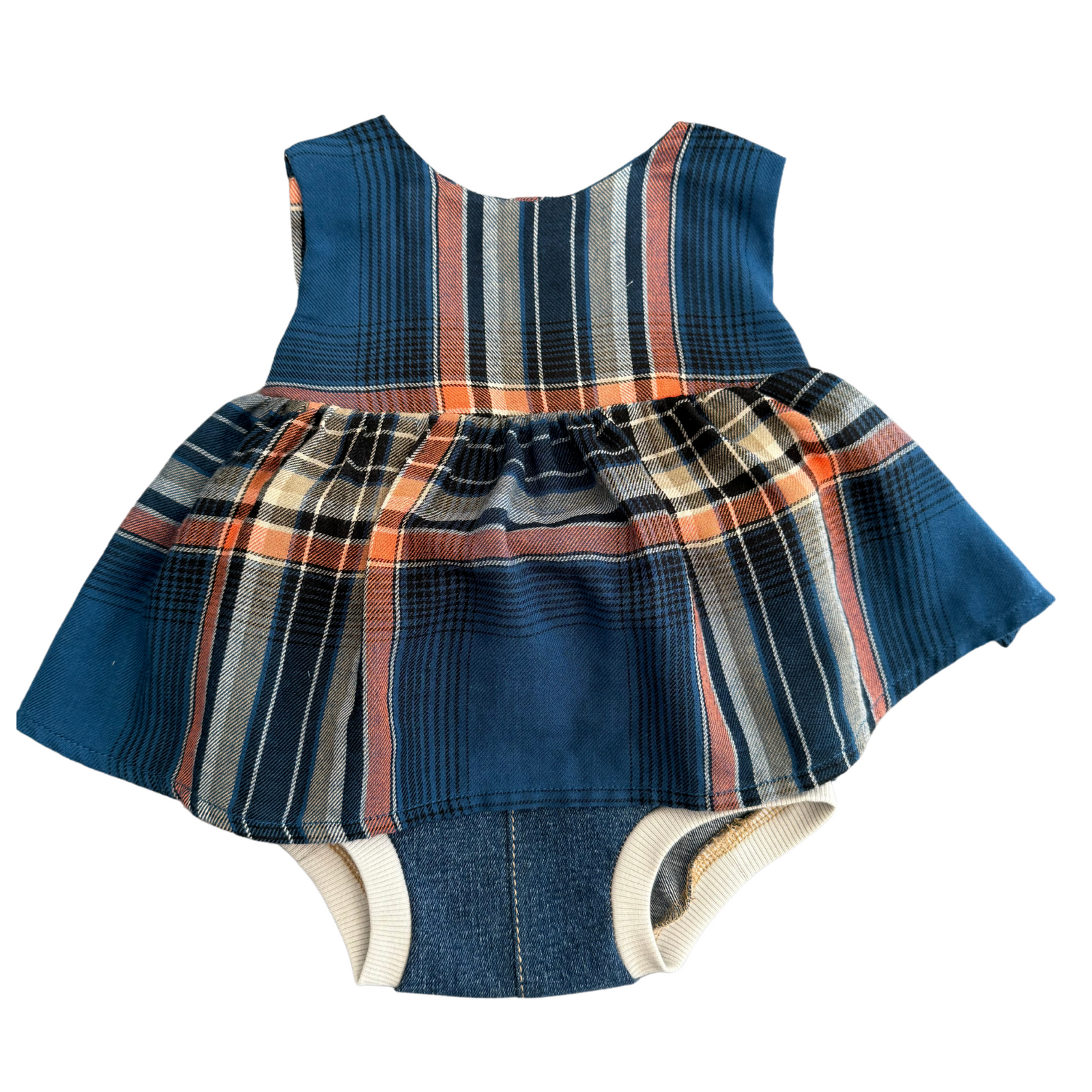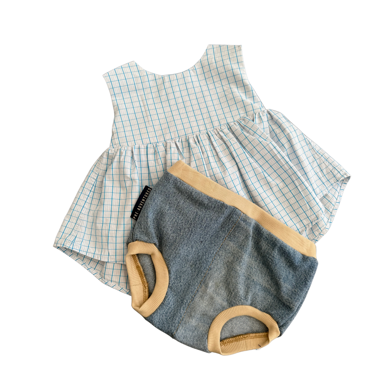 Fyne's Meadow Dress is simply adorable! Made from used dress shirts, each Meadow Dress is one of a kind. Used dress shirts are the perfect garment to upcycle because they are often made of high-quality material and only have small parts of damage that make them unwearable in their original form. The dress features buttons and a tie at the back and is paired with a loose-fitting jean bloomer for extra versatility.