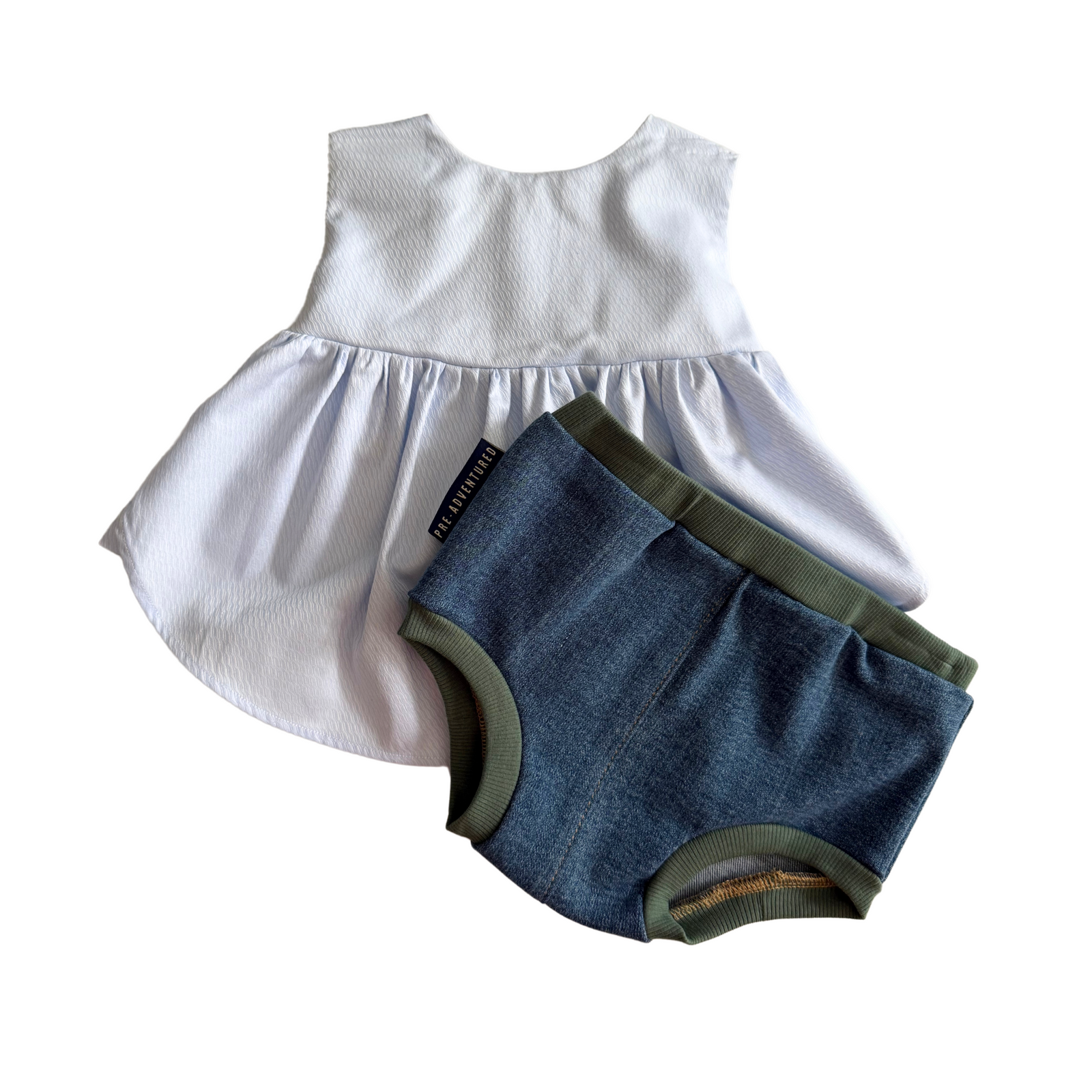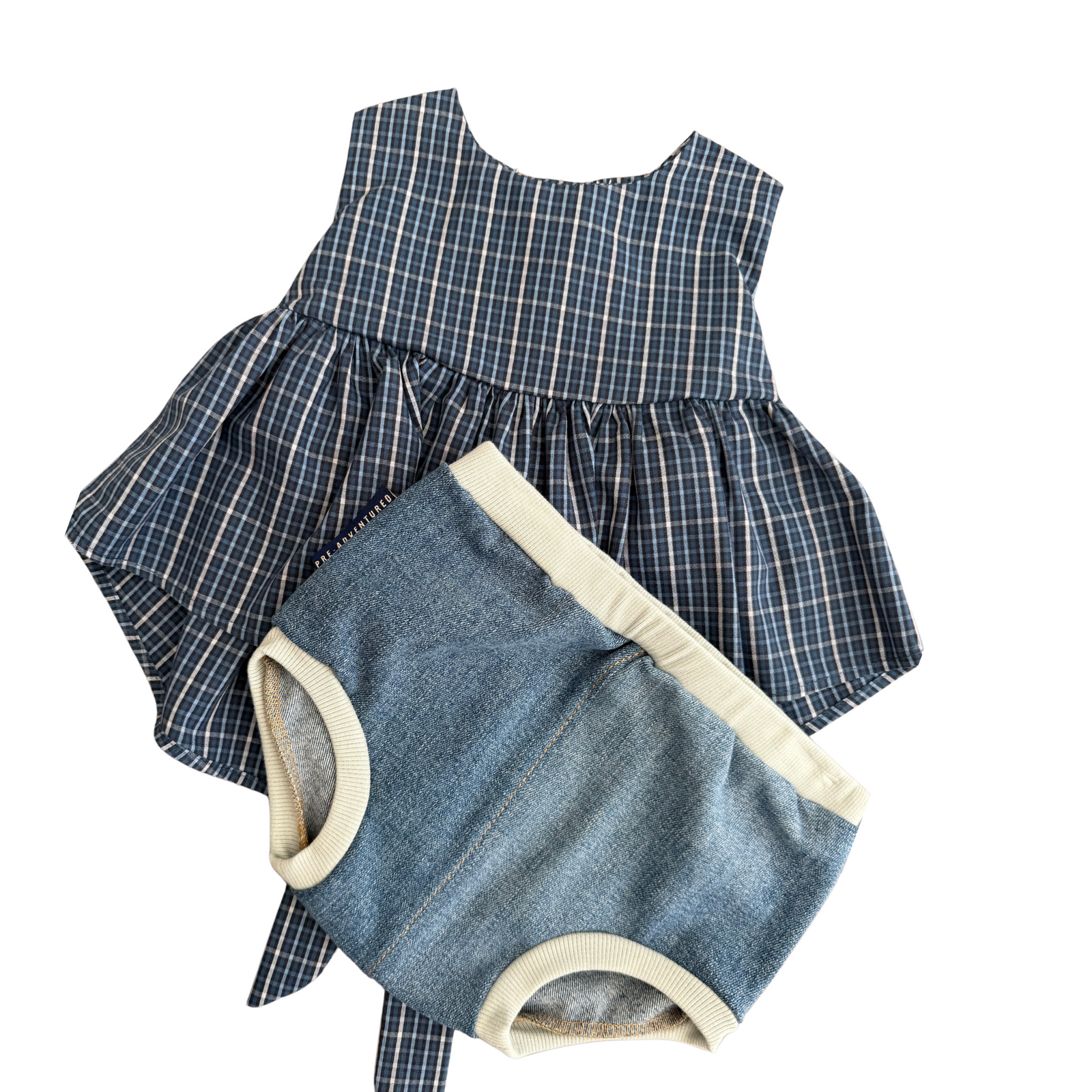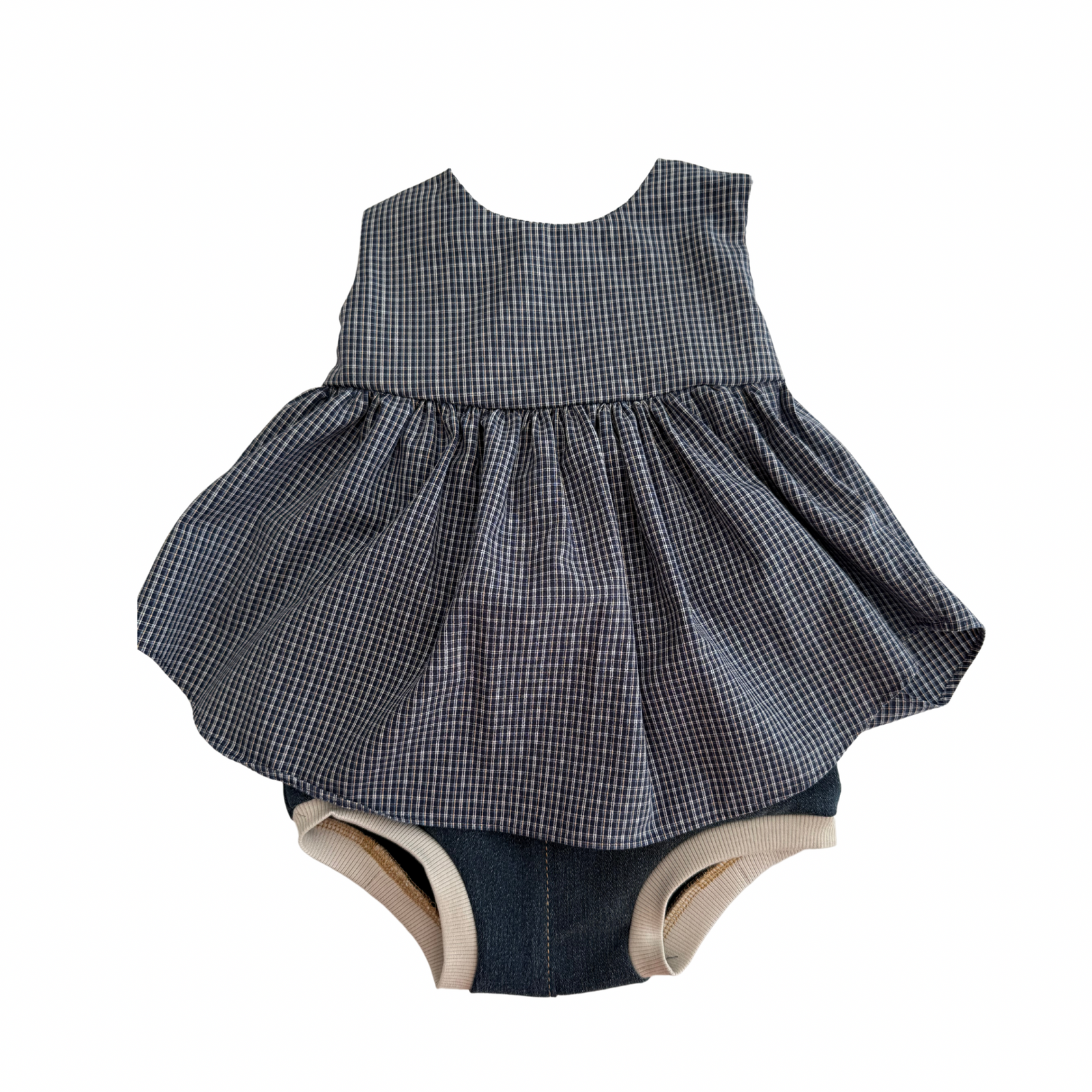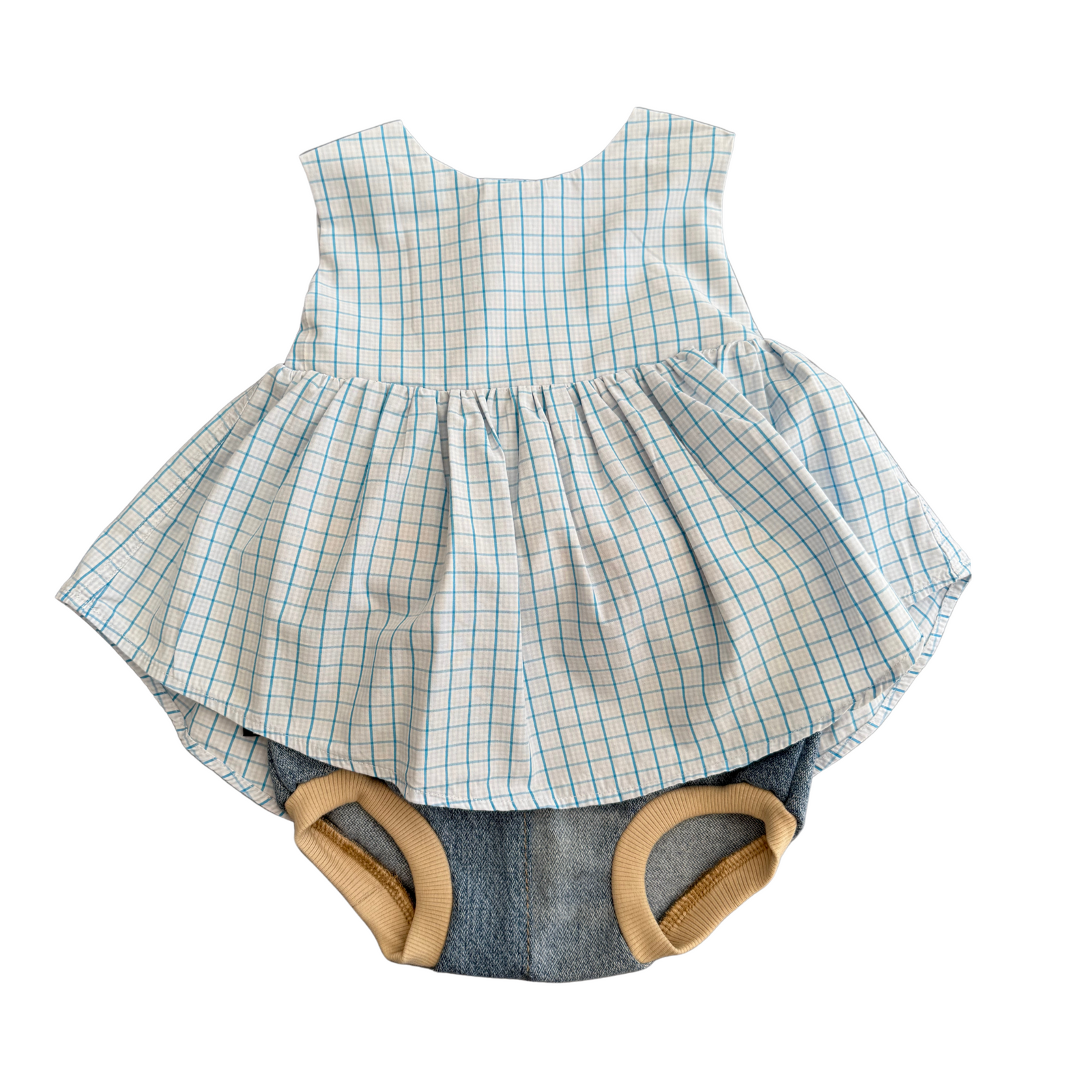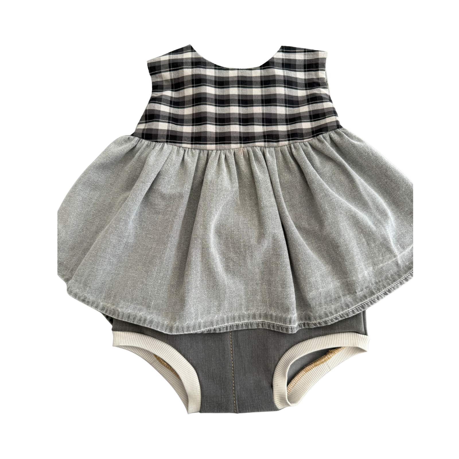 Fyne's Meadow Dress is simply adorable! Made from used dress shirts, each Meadow Dress is one of a kind. Used dress shirts are the perfect garment to upcycle because they are often made of high-quality material and only have small parts of damage that make them unwearable in their original form. The dress features buttons and a tie at the back and is paired with a loose-fitting jean bloomer for extra versatility.