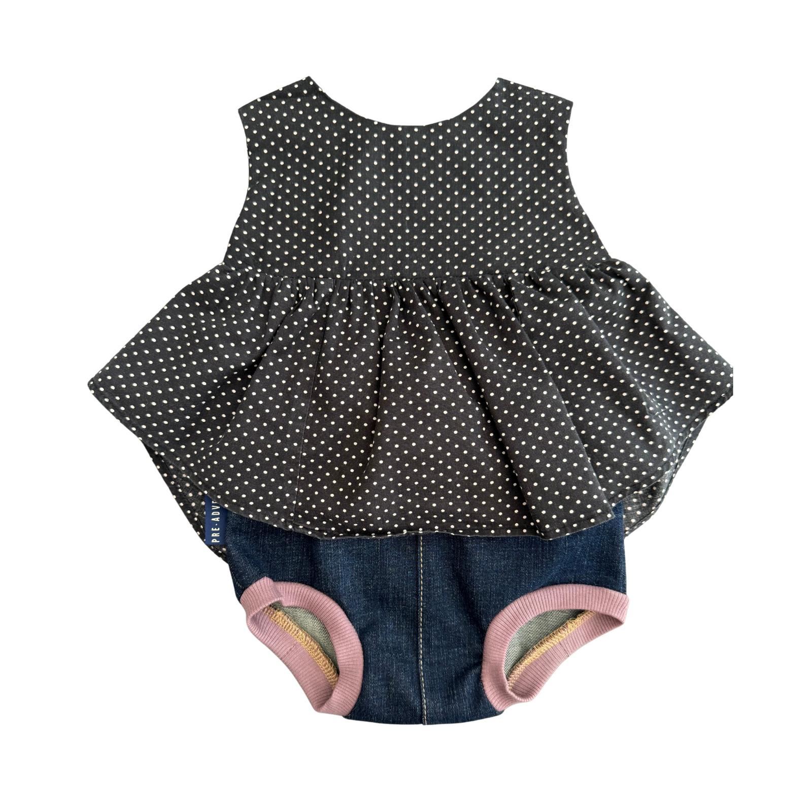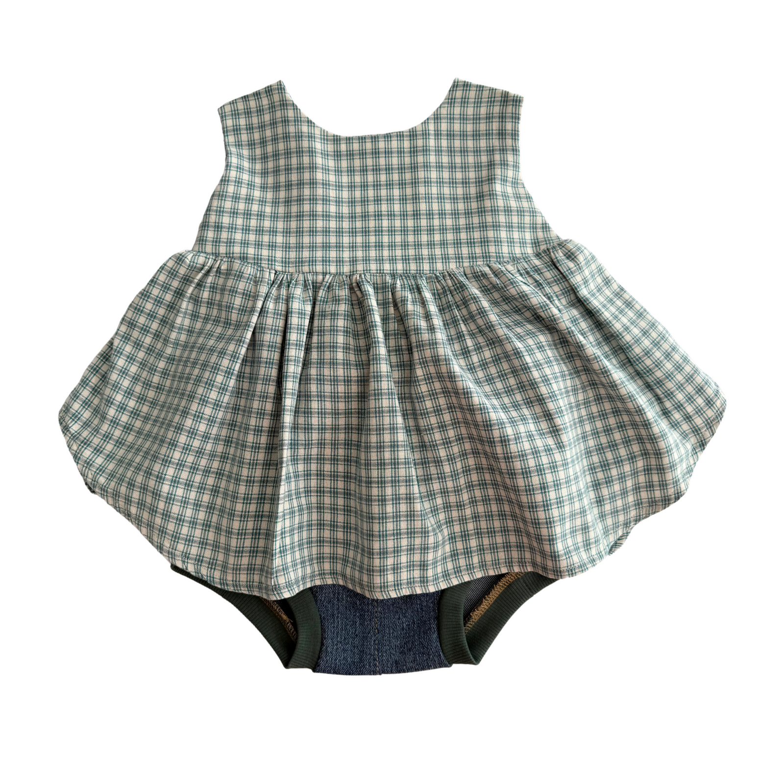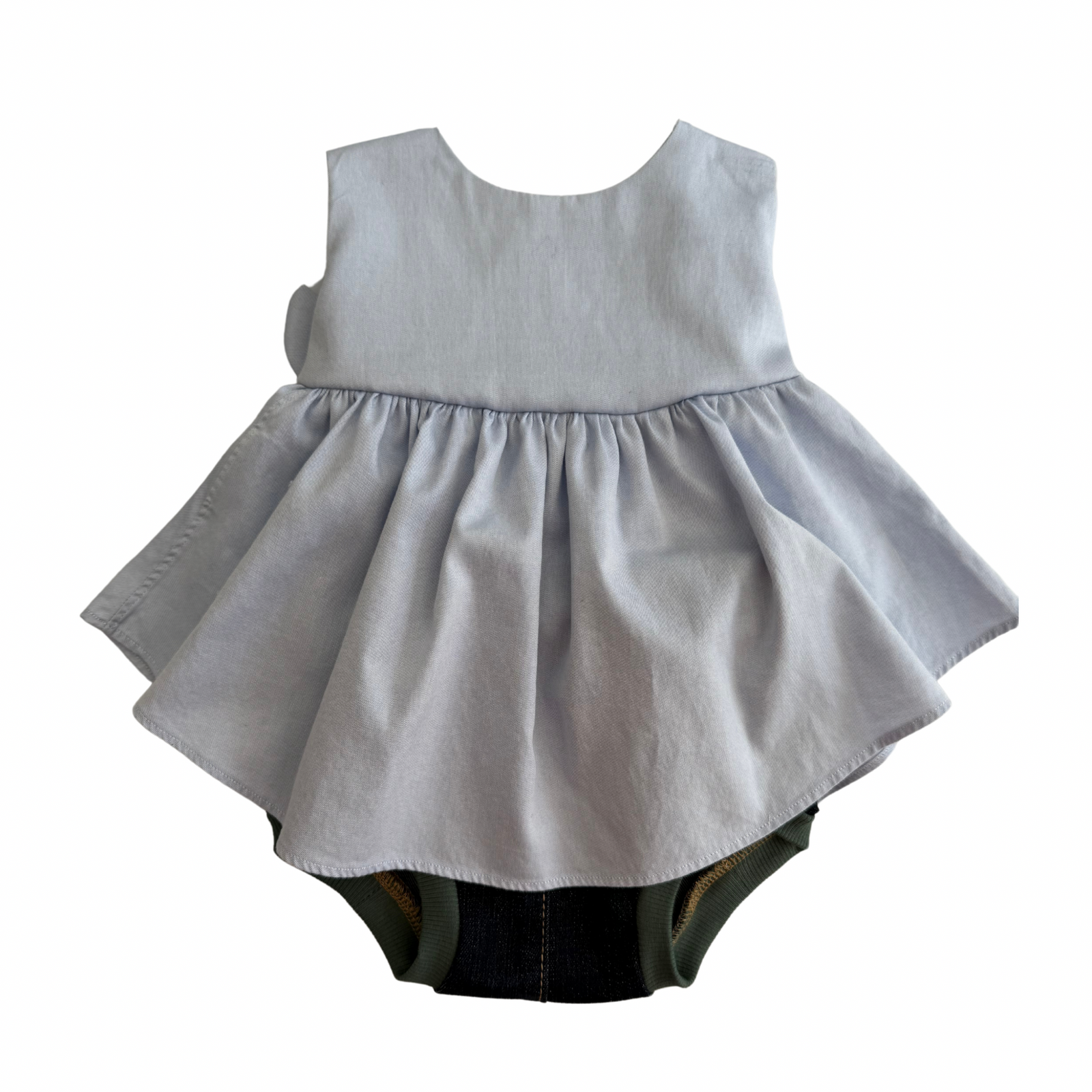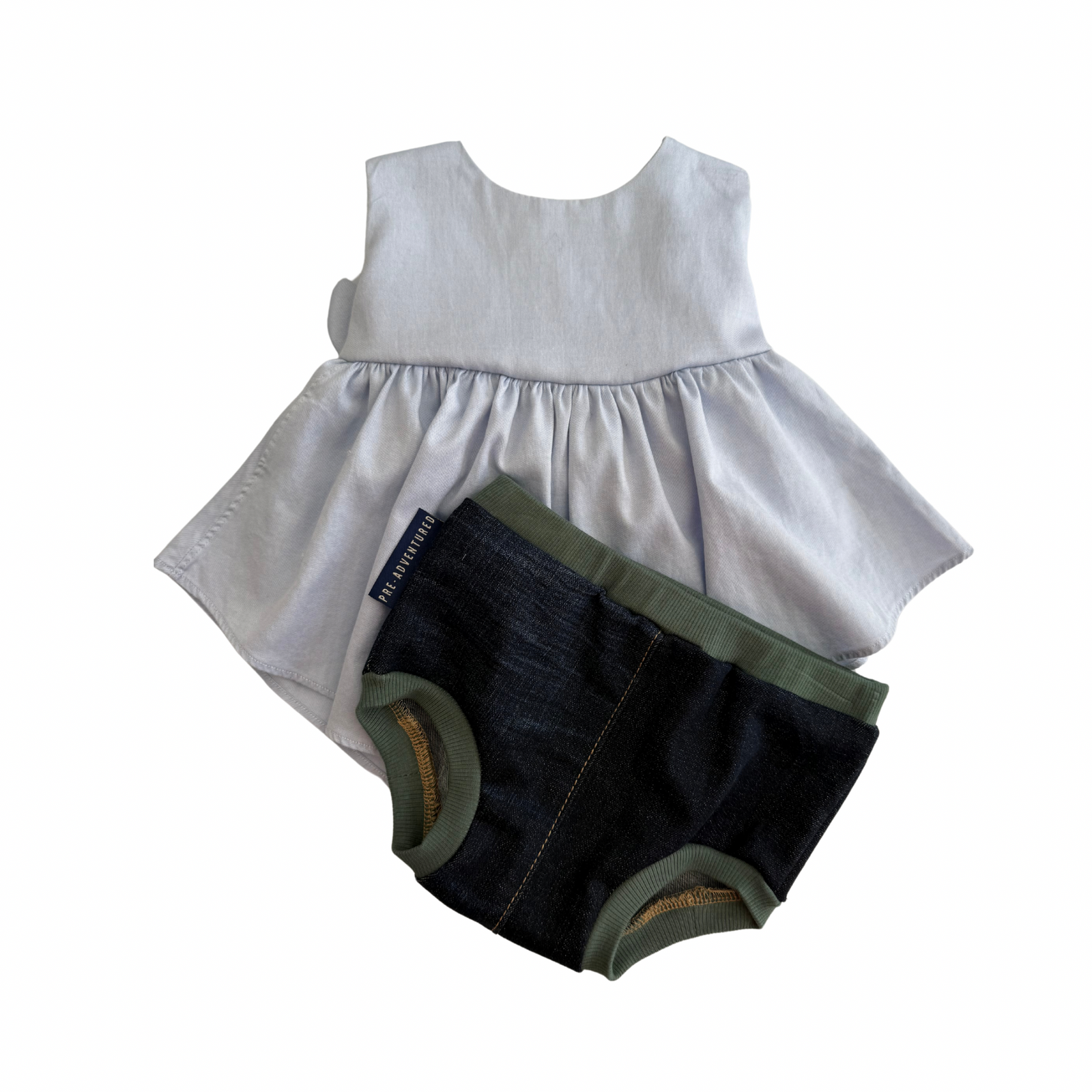 Fyne's Meadow Dress is simply adorable! Made from used dress shirts, each Meadow Dress is one of a kind. Used dress shirts are the perfect garment to upcycle because they are often made of high-quality material and only have small parts of damage that make them unwearable in their original form. The dress features buttons and a tie at the back and is paired with a loose-fitting jean bloomer for extra versatility.