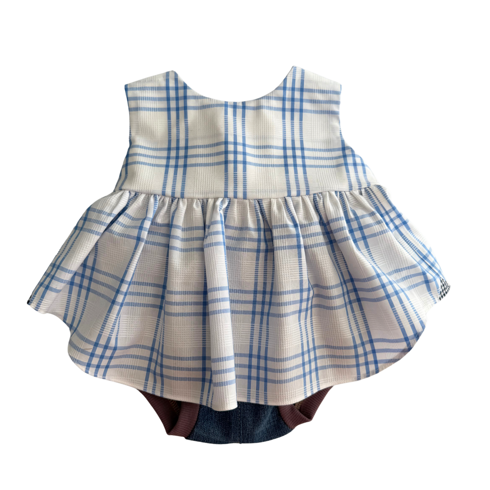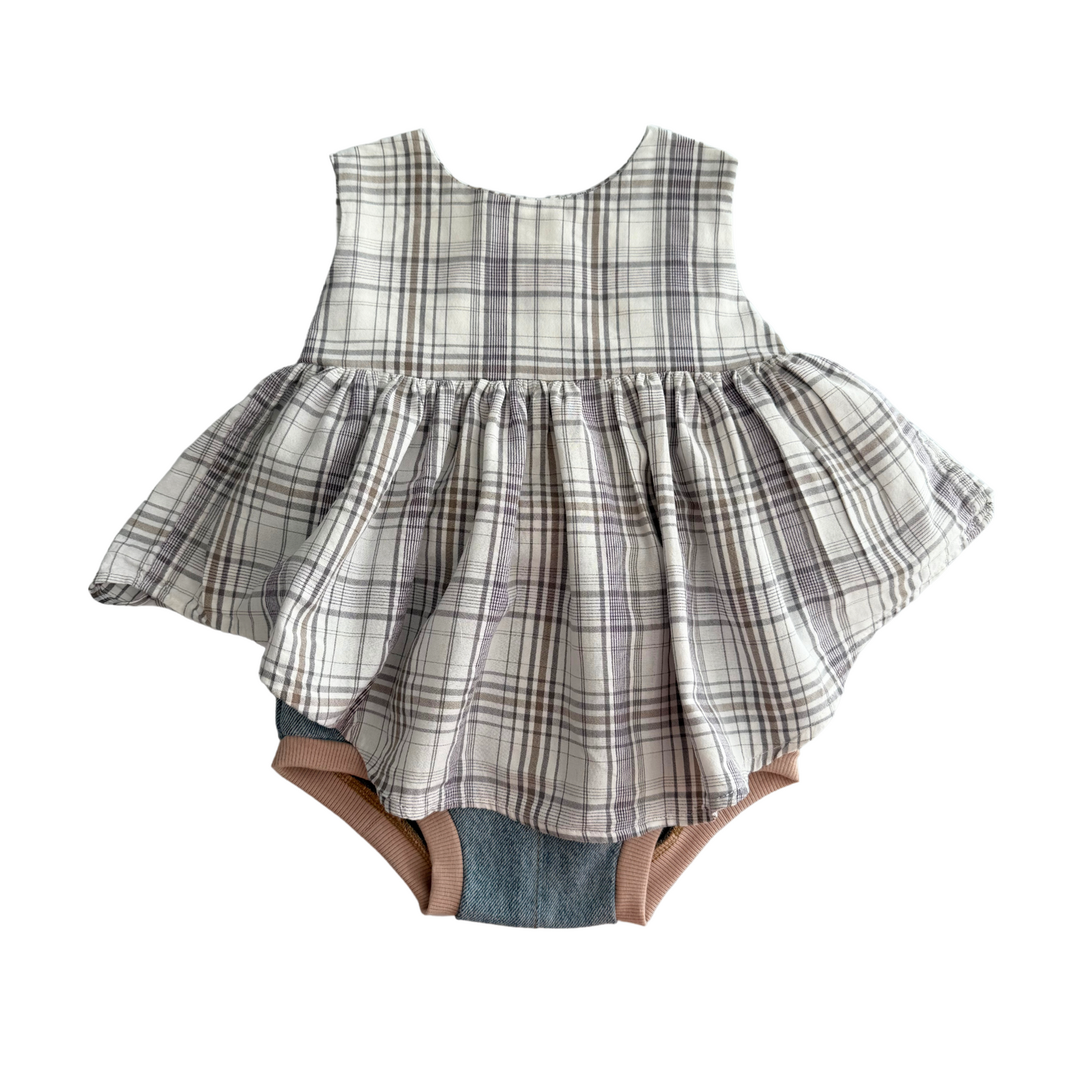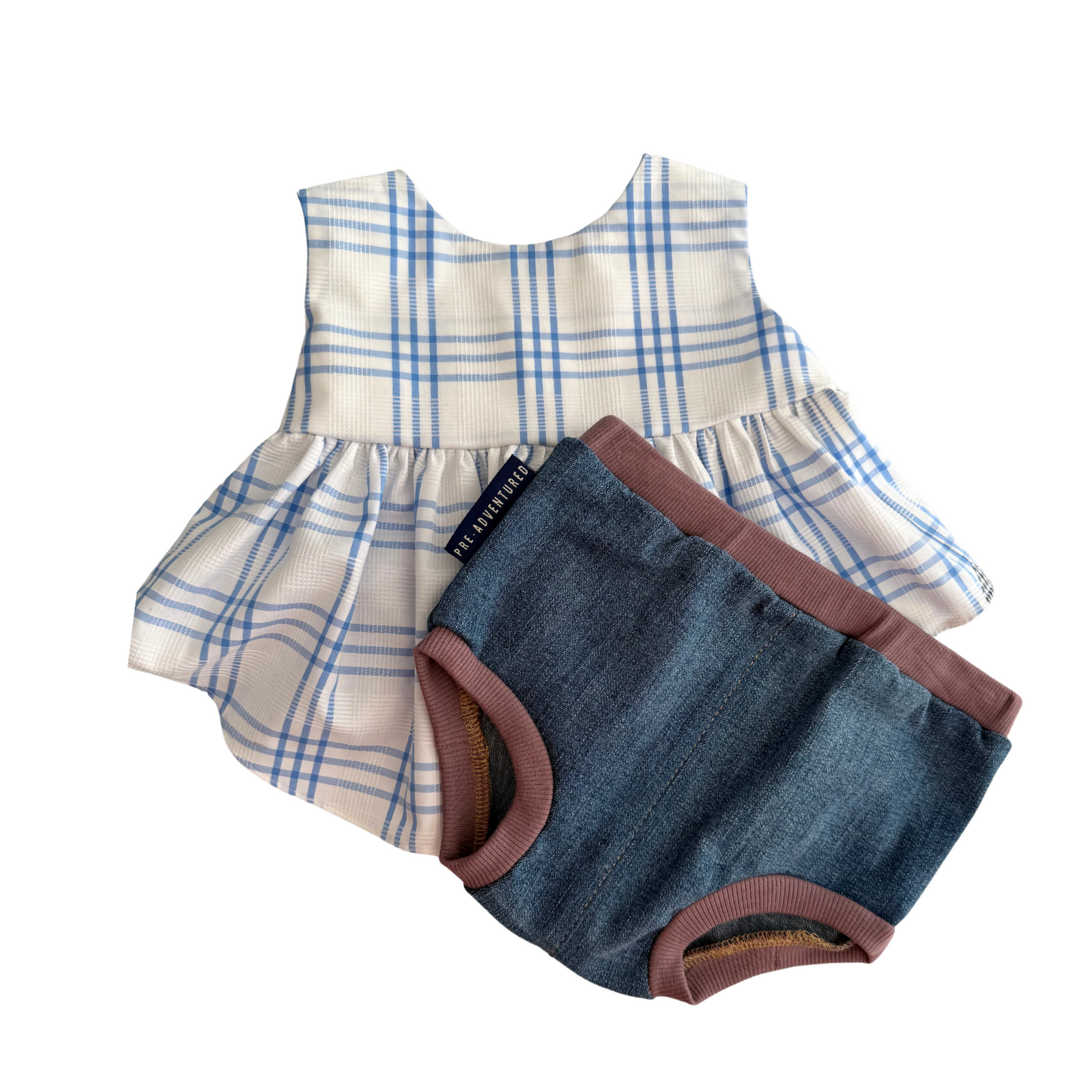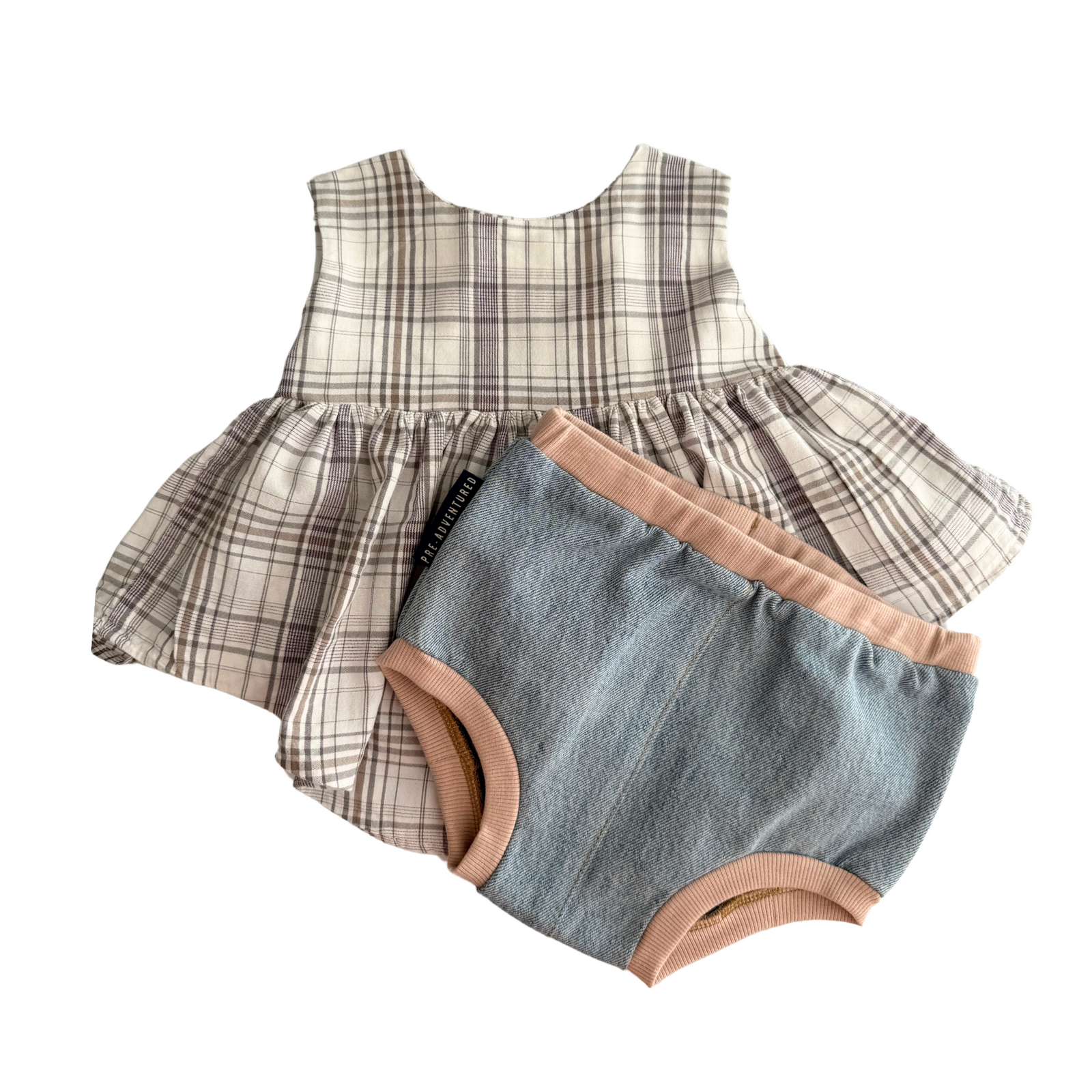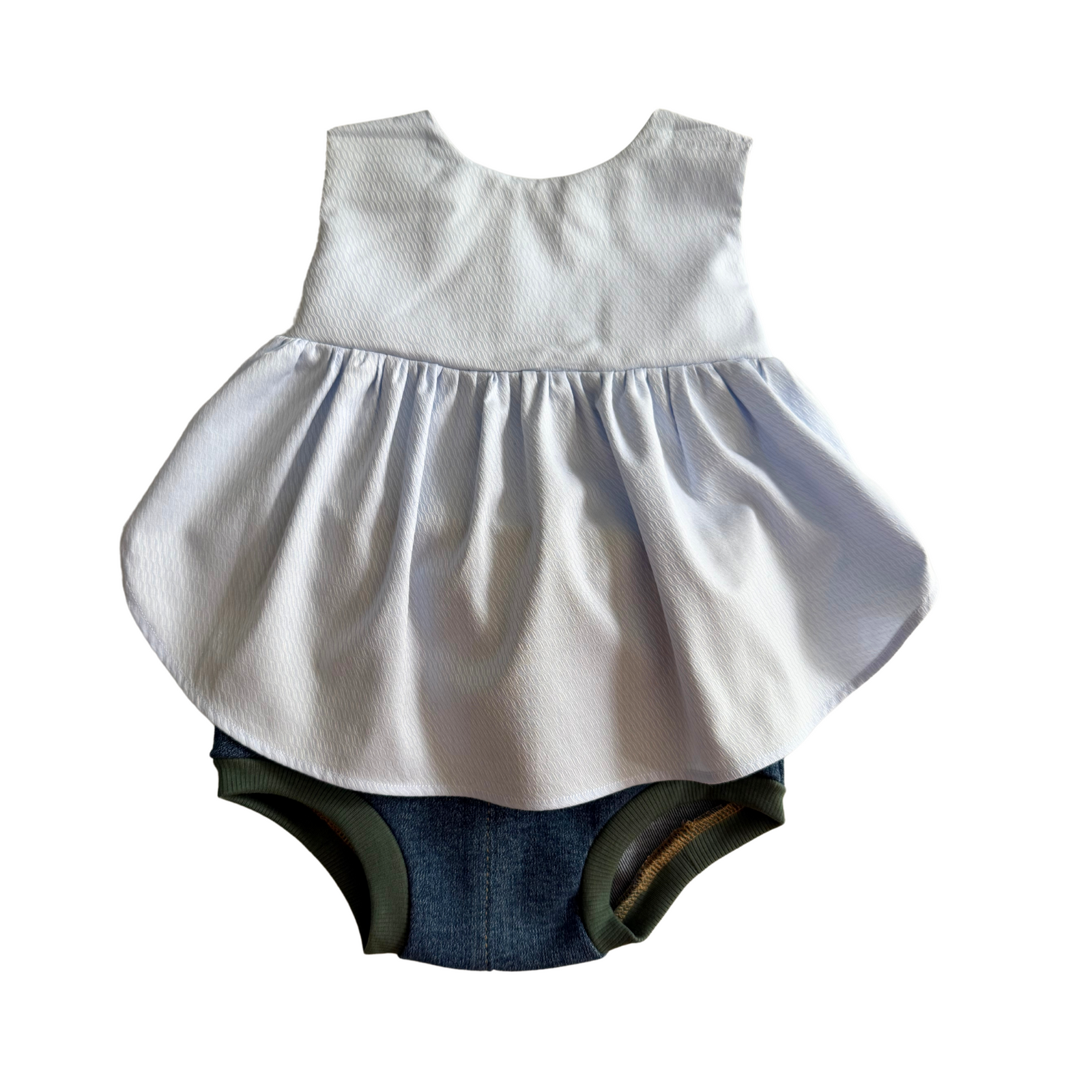 Fyne's Meadow Dress is simply adorable! Made from used dress shirts, each Meadow Dress is one of a kind. Used dress shirts are the perfect garment to upcycle because they are often made of high-quality material and only have small parts of damage that make them unwearable in their original form. The dress features buttons and a tie at the back and is paired with a loose-fitting jean bloomer for extra versatility.